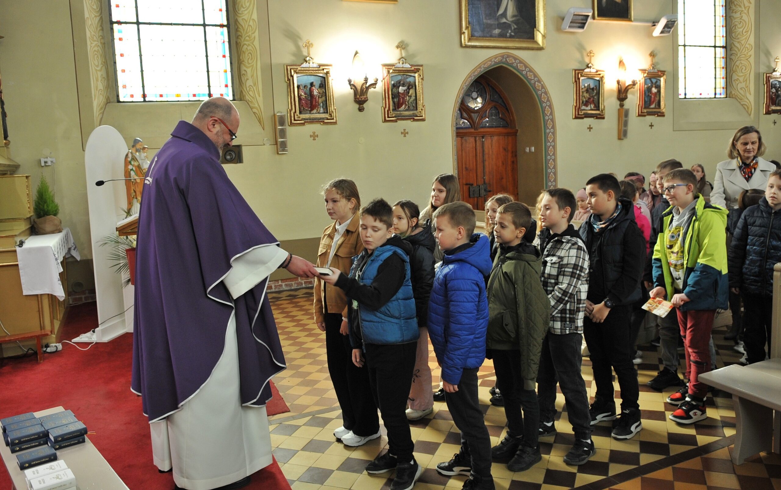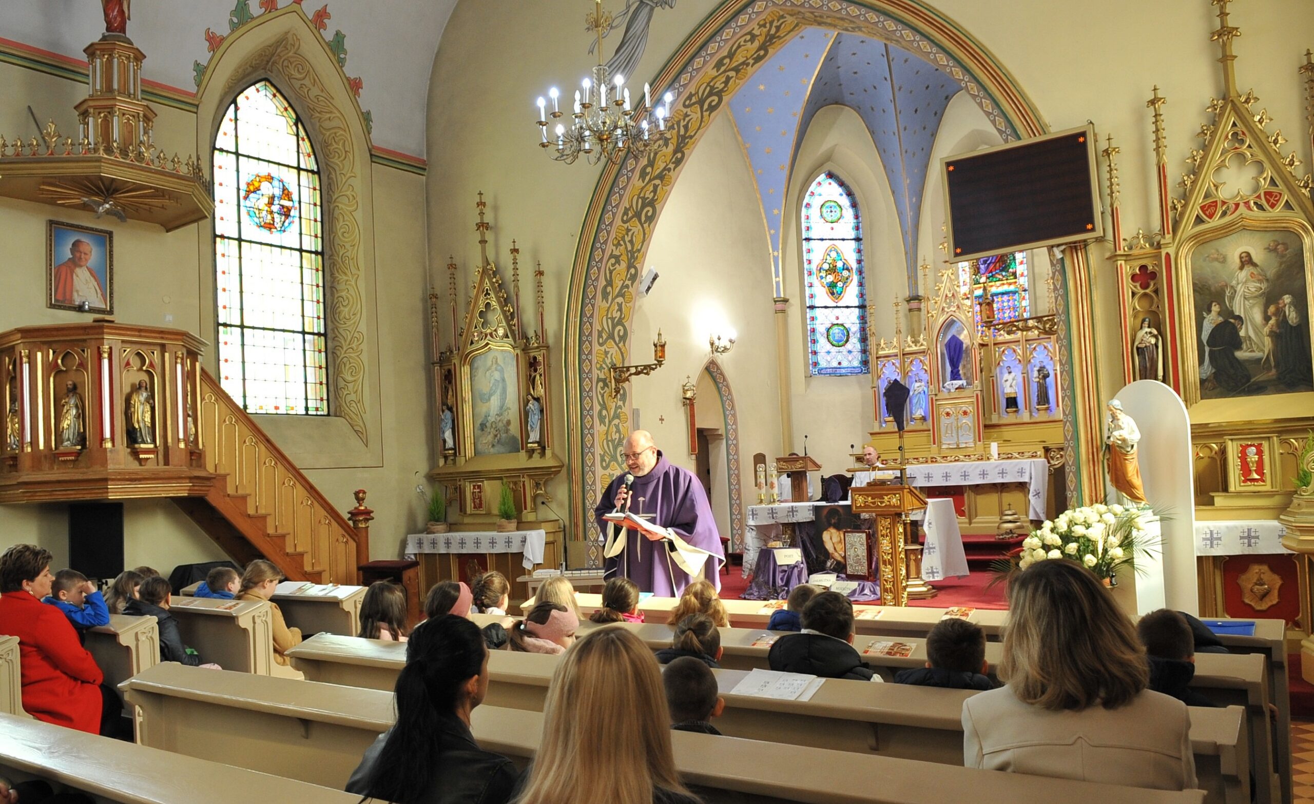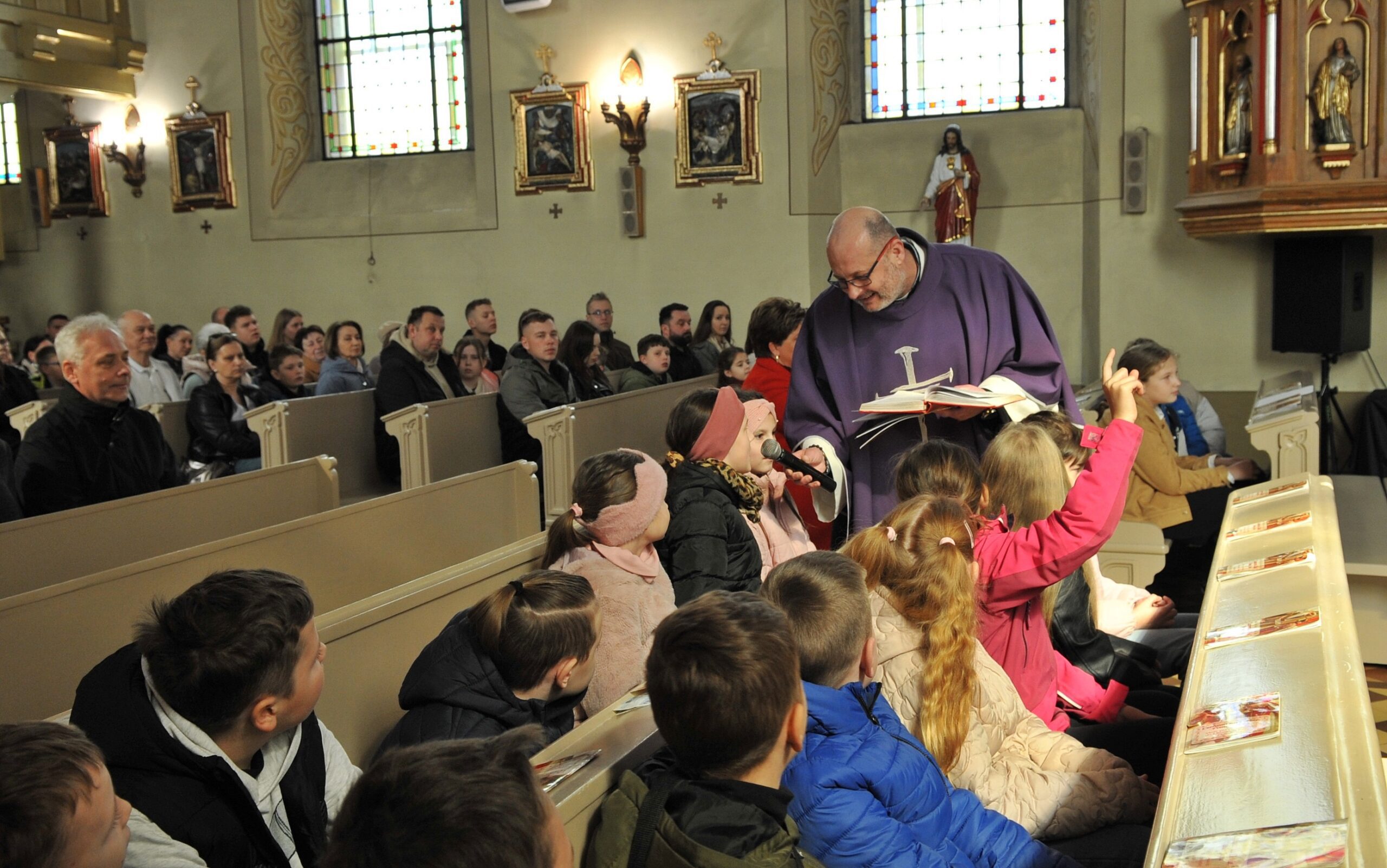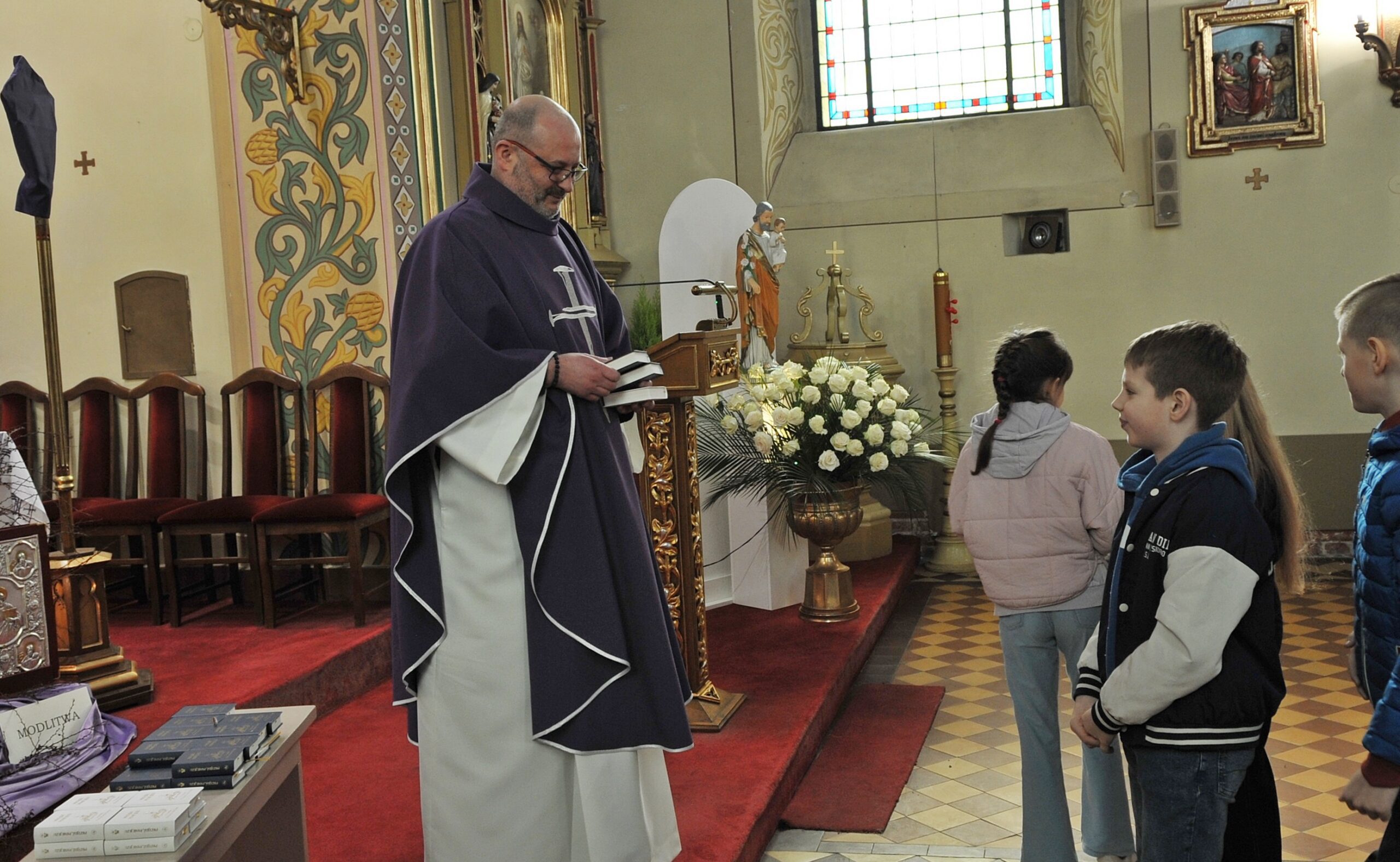 Proboszcz ks. Mariusz Kostrzewski zwracał się do wiernych tymi słowami a podczas poświęcenia modlitewników dzieciom przygotowującym się od I komunii prosił wiernych aby nie zapomnieli gdzie są ich książeczki.