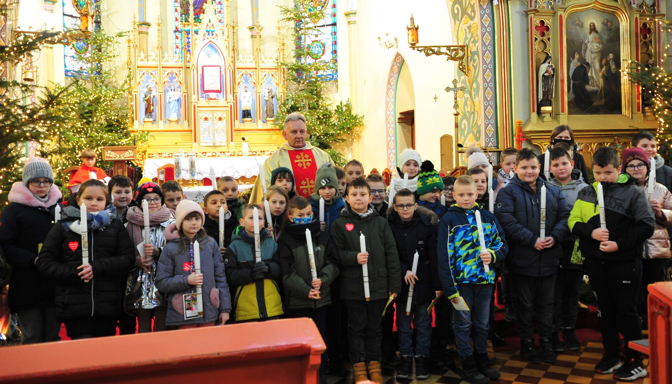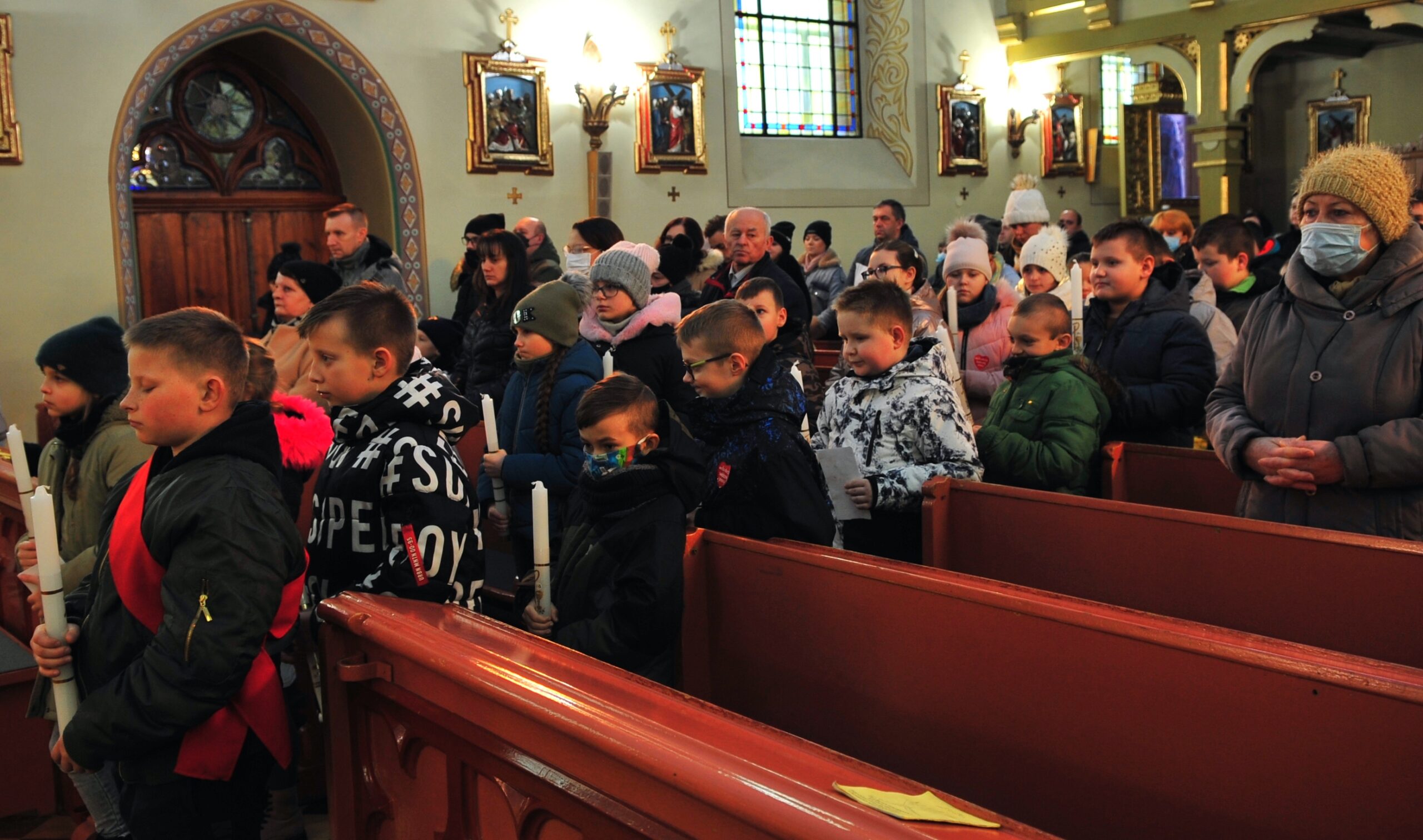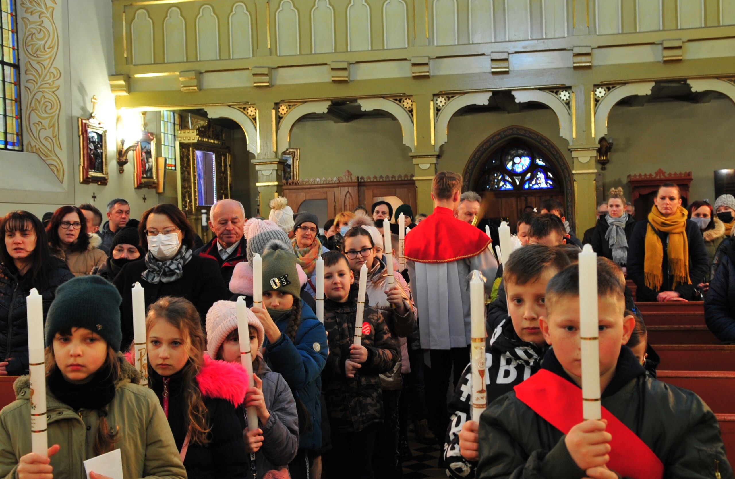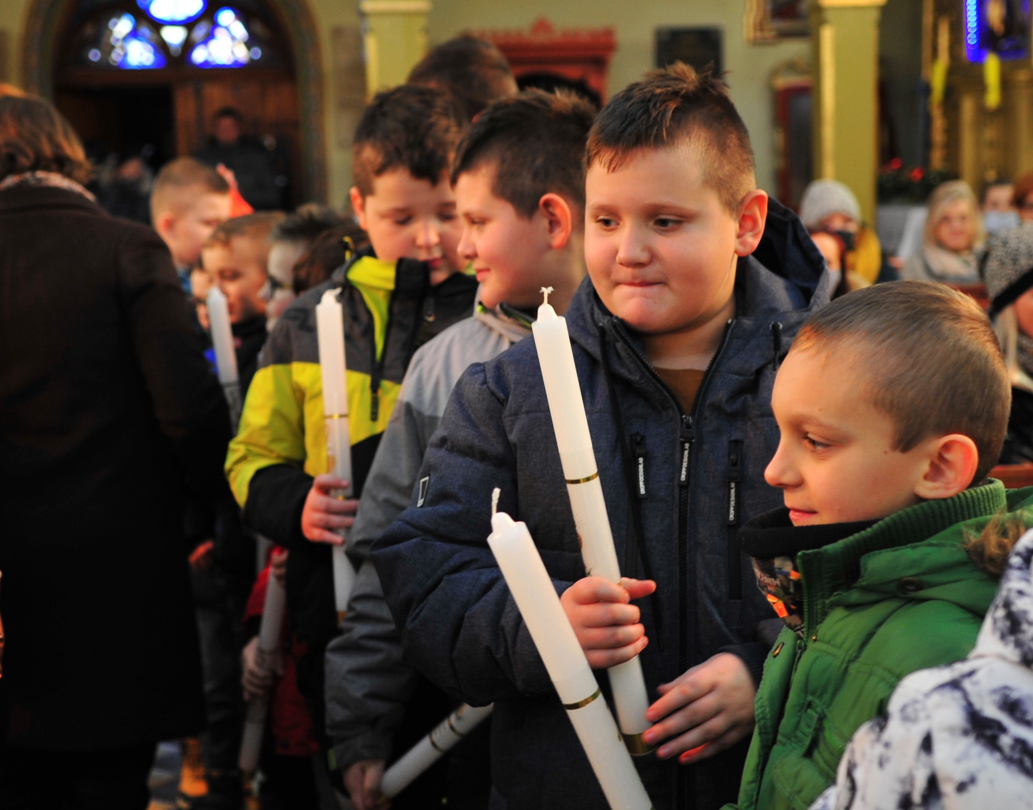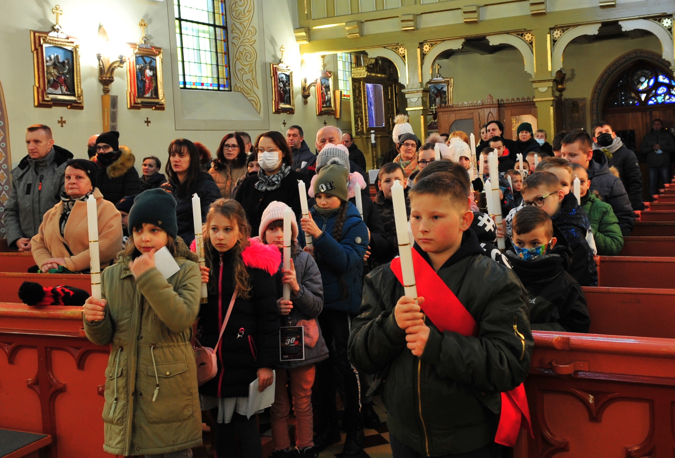 W niedzielę 30 stycznia br. na  Mszy św. o godz. 11:30, dzieci klas trzecich, które w tym roku przygotowują się do przyjęcia I Komunii św., uczestniczyły w obrzędzie poświęcenia świec komunijnych.