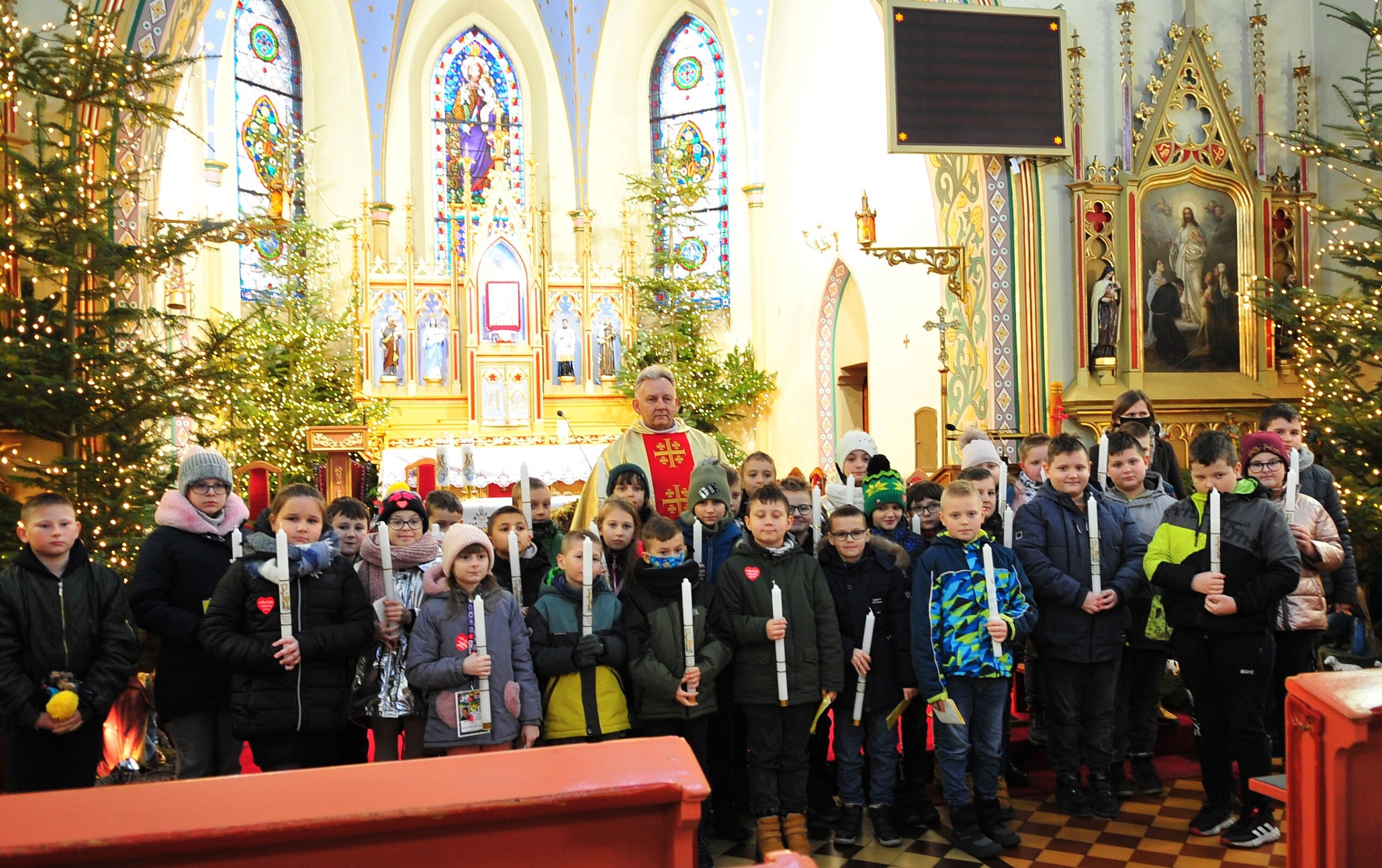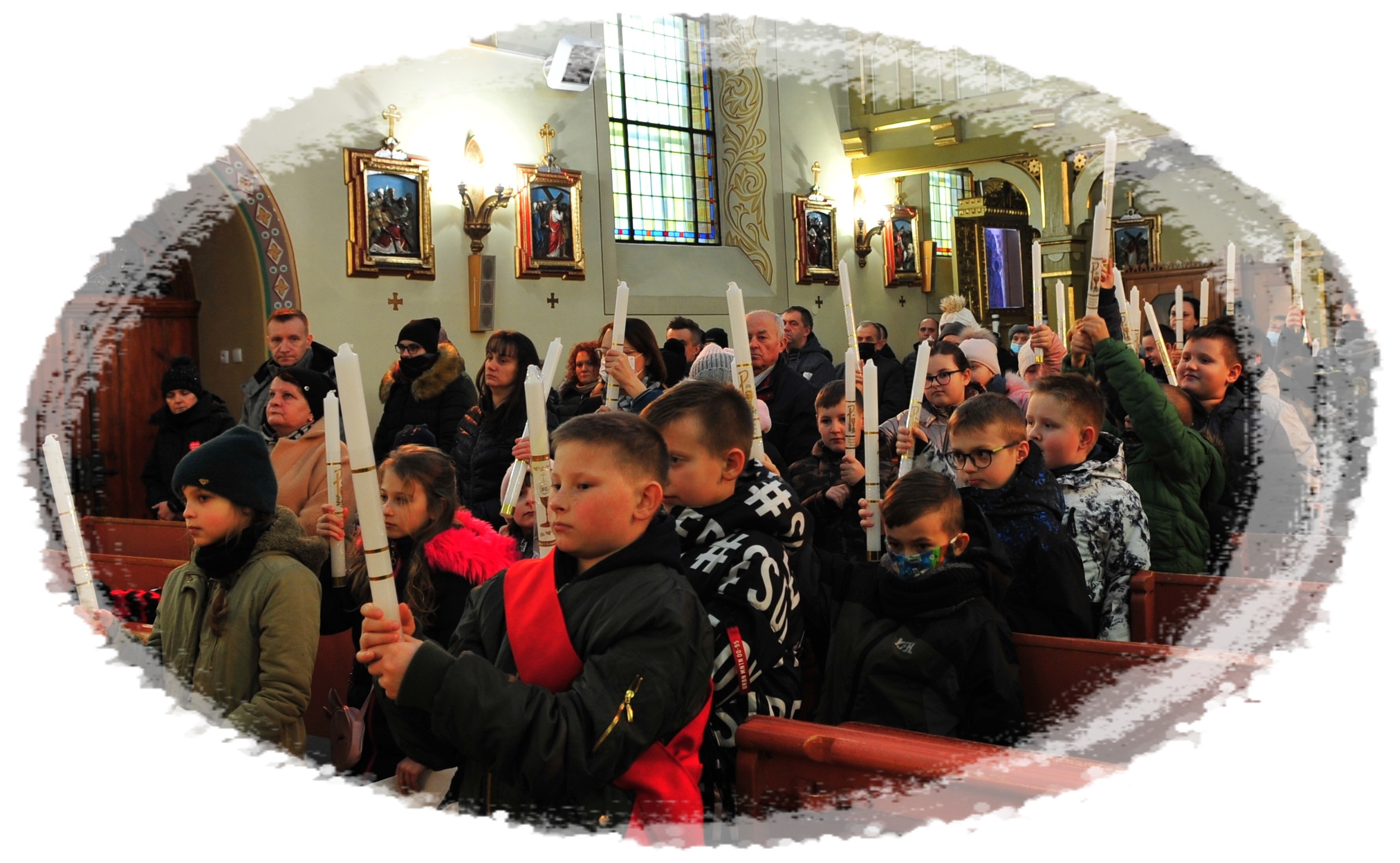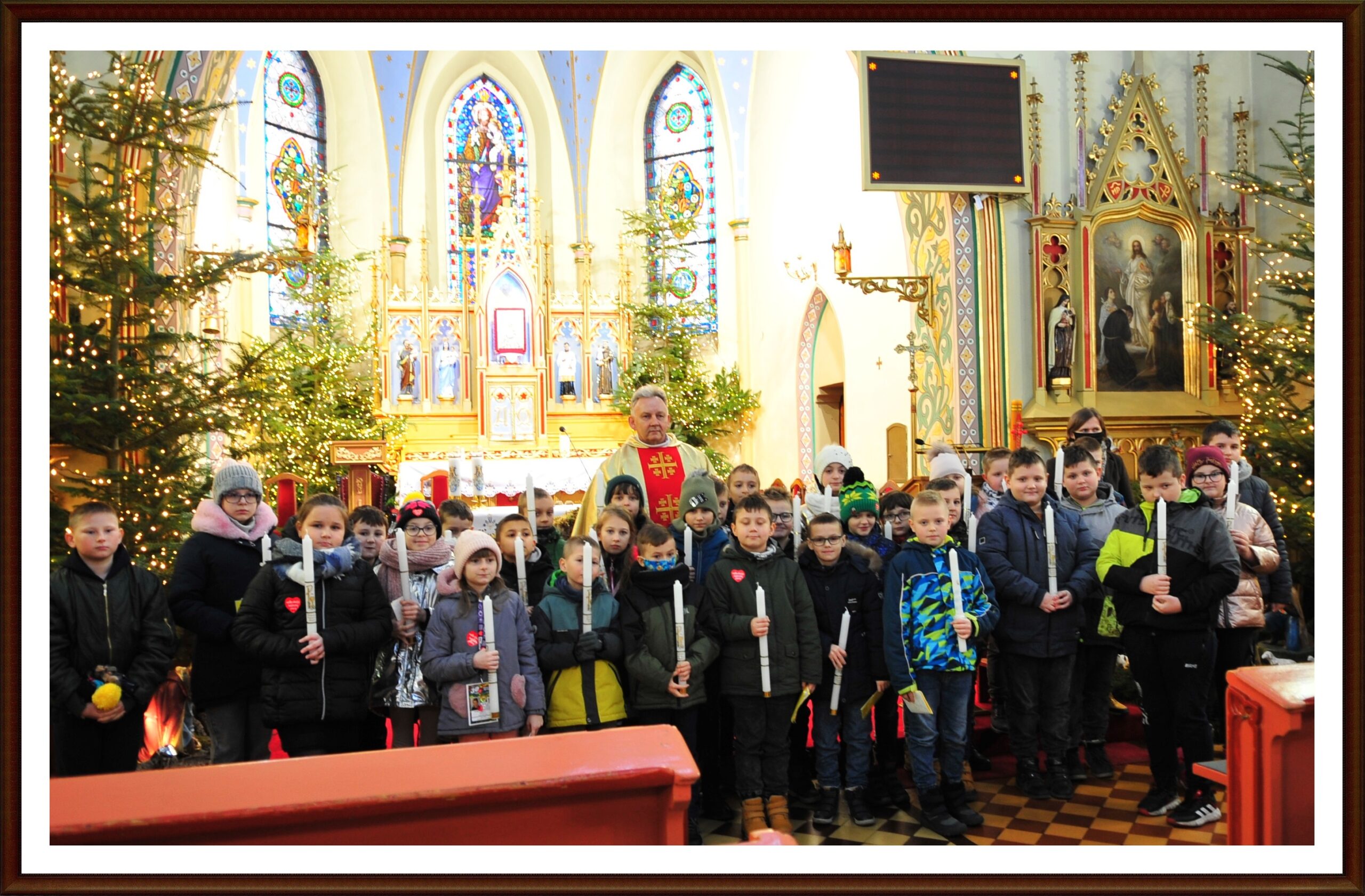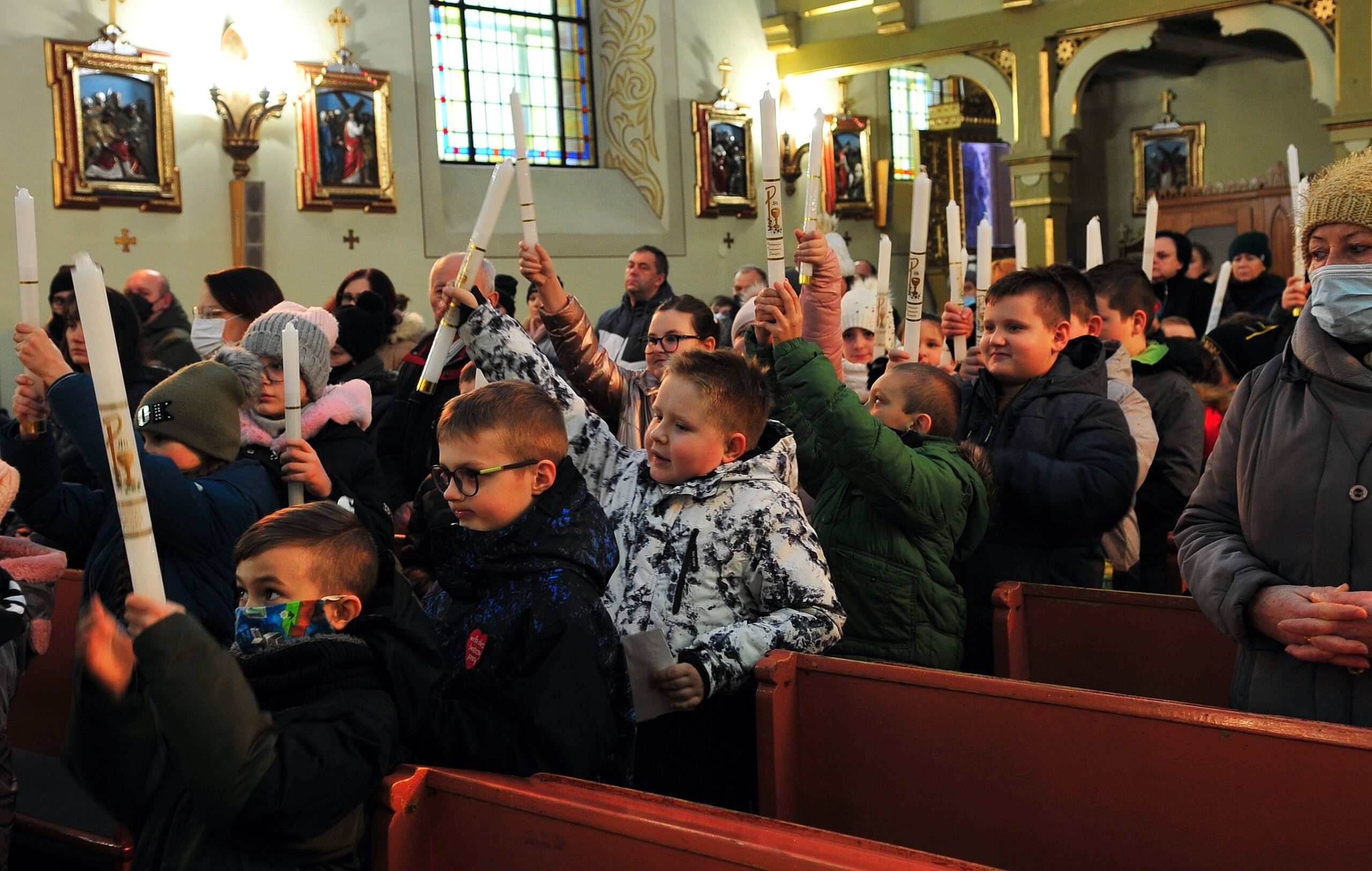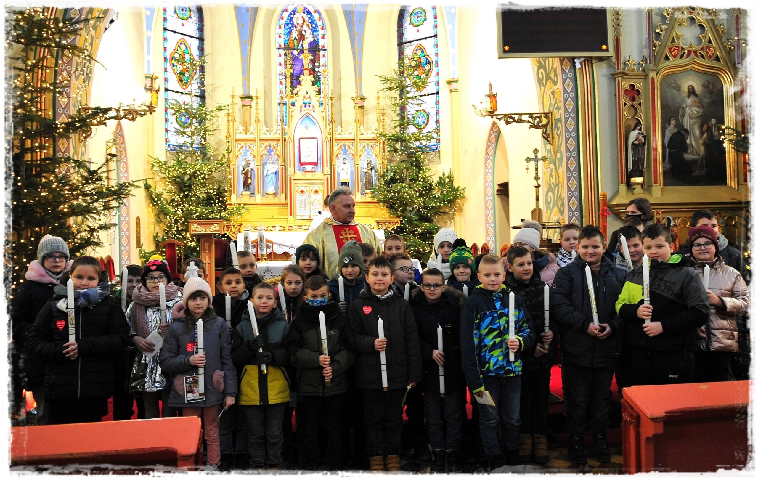 W niedzielę 30 stycznia br. na  Mszy św. o godz. 11:30, dzieci klas trzecich, które w tym roku przygotowują się do przyjęcia I Komunii św., uczestniczyły w obrzędzie poświęcenia świec komunijnych.