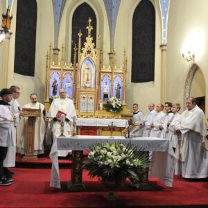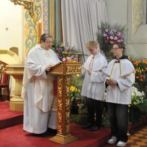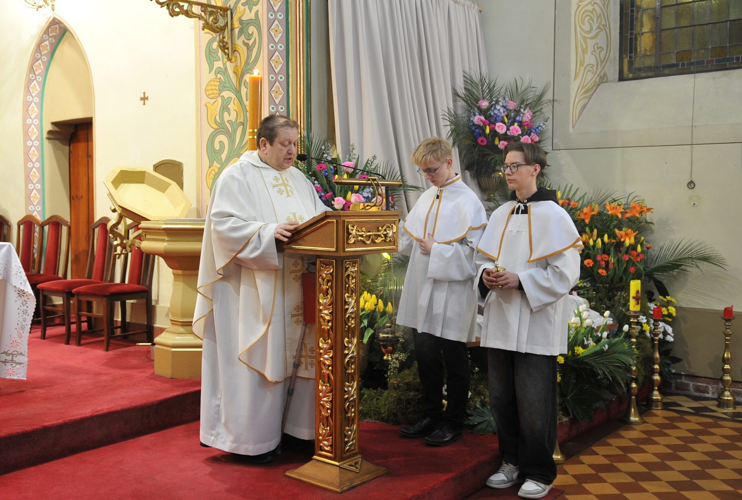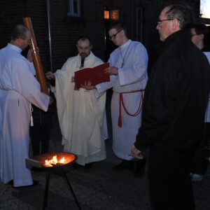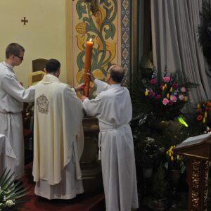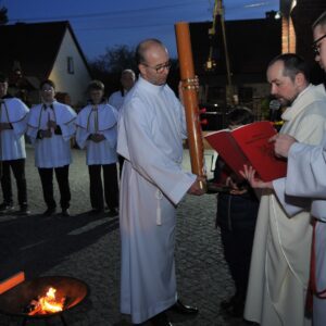 Kapłan żłobi na paschale rylcem krzyż, a nad nim grecką literę alfa, pod krzyżem literę omega, a na czterech polach między ramionami krzyża cyfry bieżącego roku. Jednocześnie głośno i wyraźnie mówi: „Chrystus wczoraj i dziś. Początek i koniec. Alfa i Omega. Do Niego należy czas i wieczność. Jemu chwała i panowanie”.