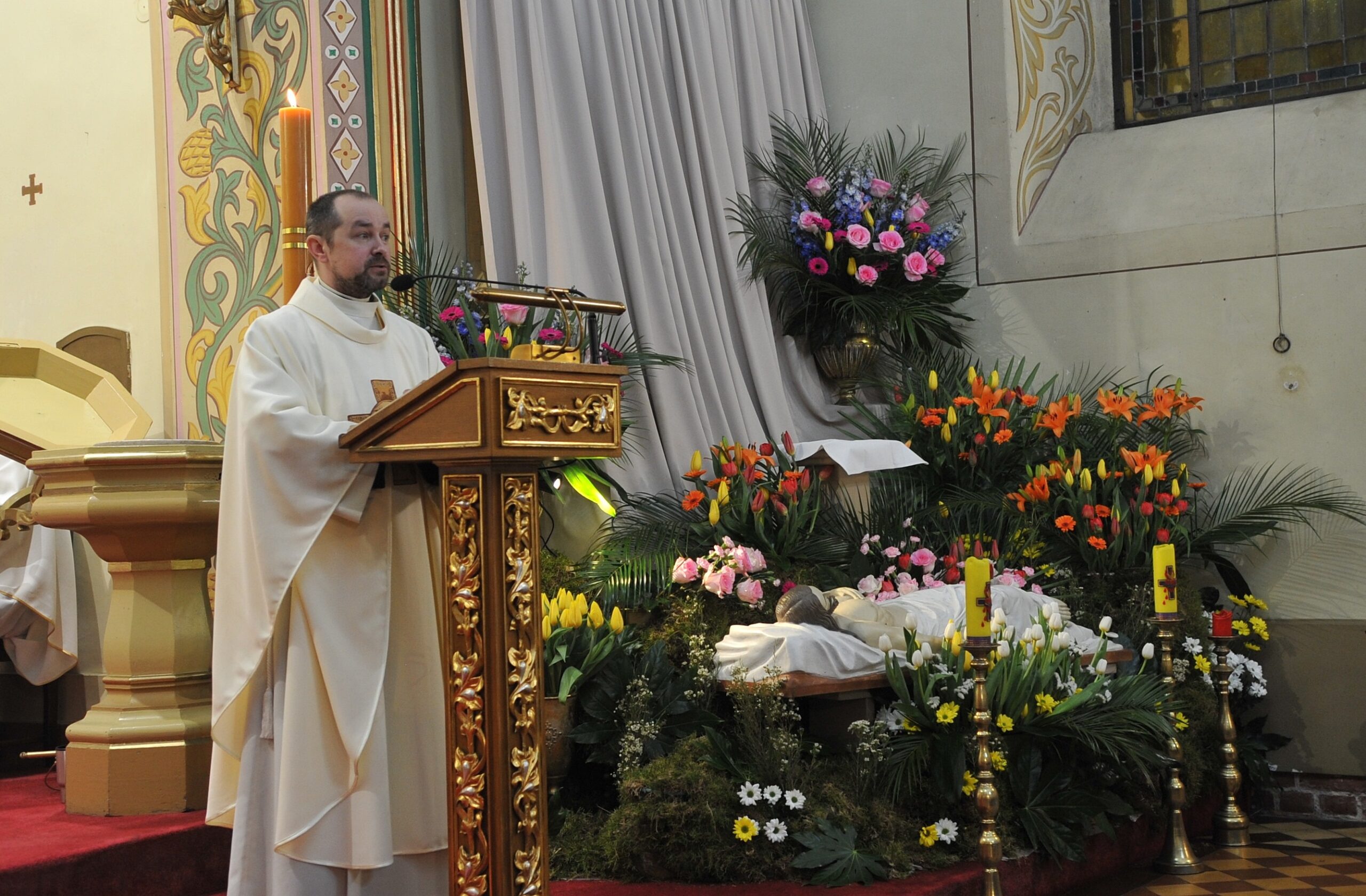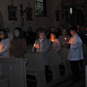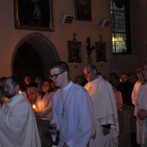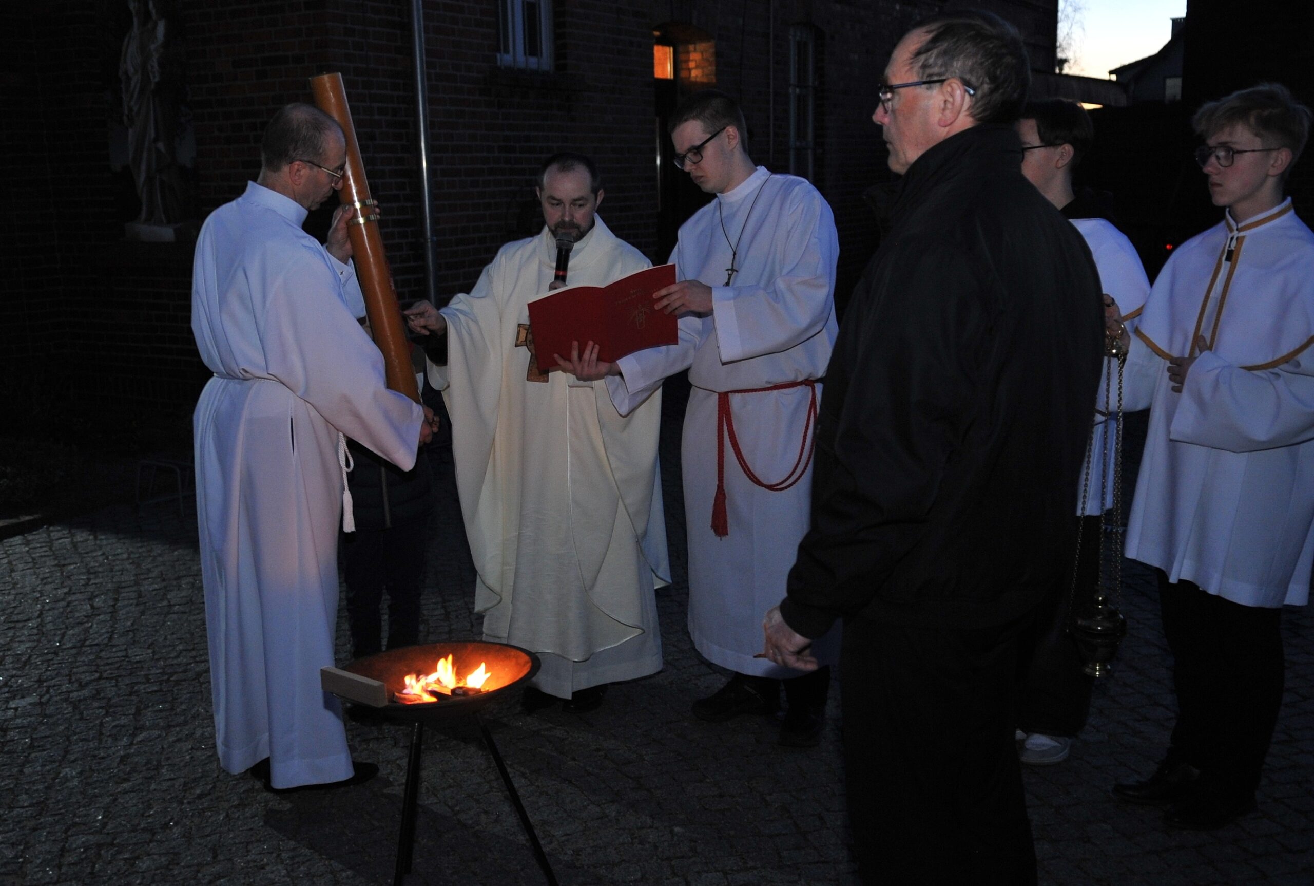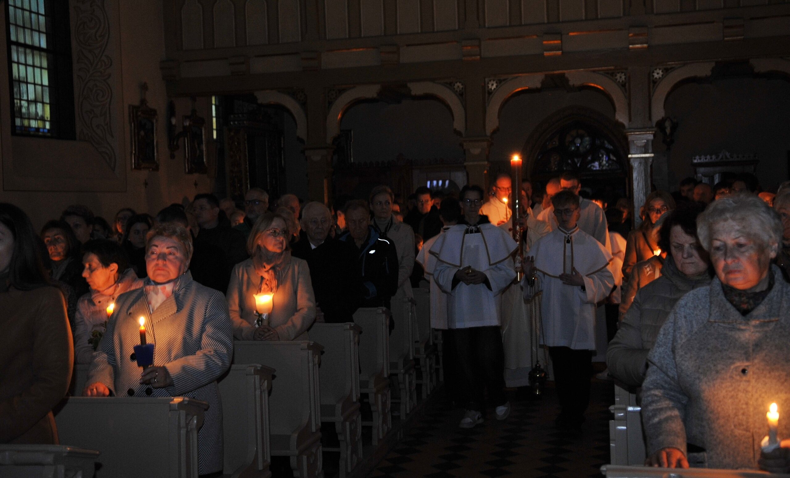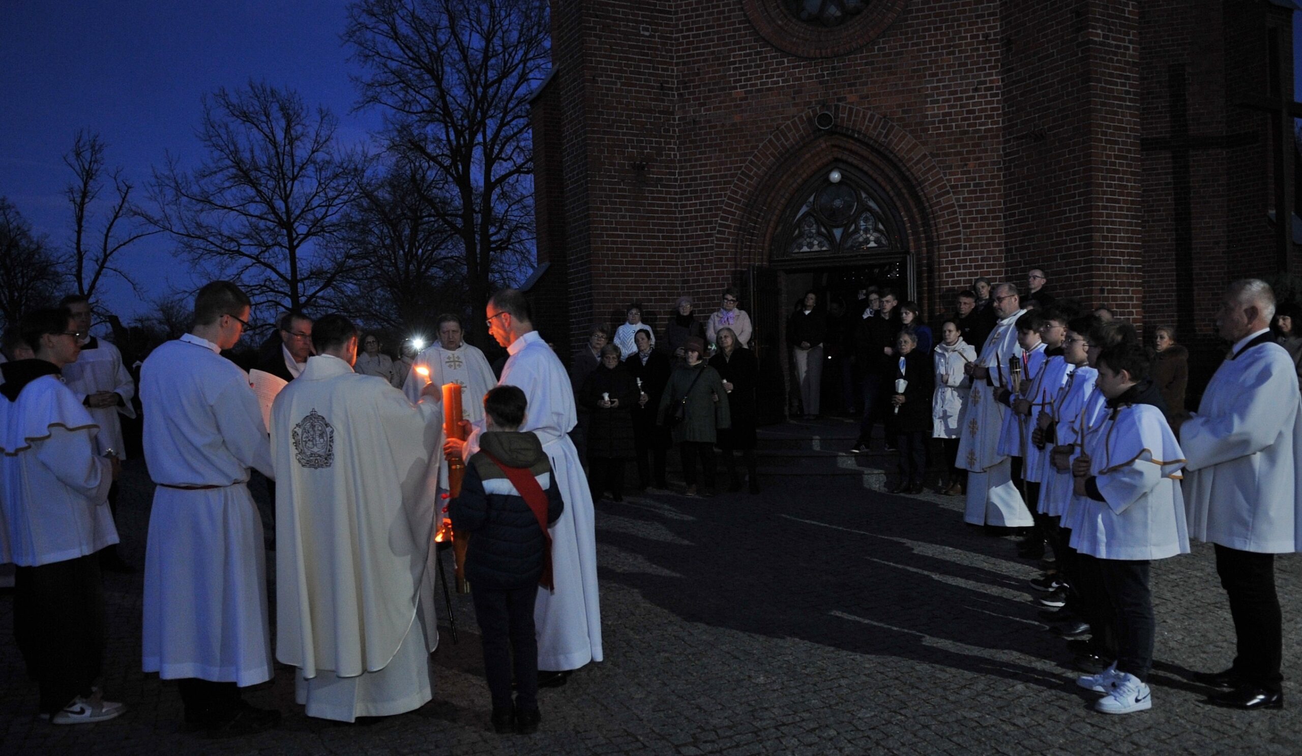 Następnie procesja wchodzi do ciemnego kościoła. Na przedzie wnoszony jest paschał. Podobnie jak synowie Izraela nocą szli za przewodem słupa ognia, tak chrześcijanie idą w ślady zmartwychwstałego Chrystusa. Światło od świecy paschalnej stopniowo rozszerza się na świece trzymane przez wiernych. Potem śpiewa się orędzie paschalne. Jest to starożytny hymn wielbiący wspaniałość Bożego dzieła odkupienia świata – od grzechu Adama aż do zbawienia, które dokonało się w Chrystusie.
